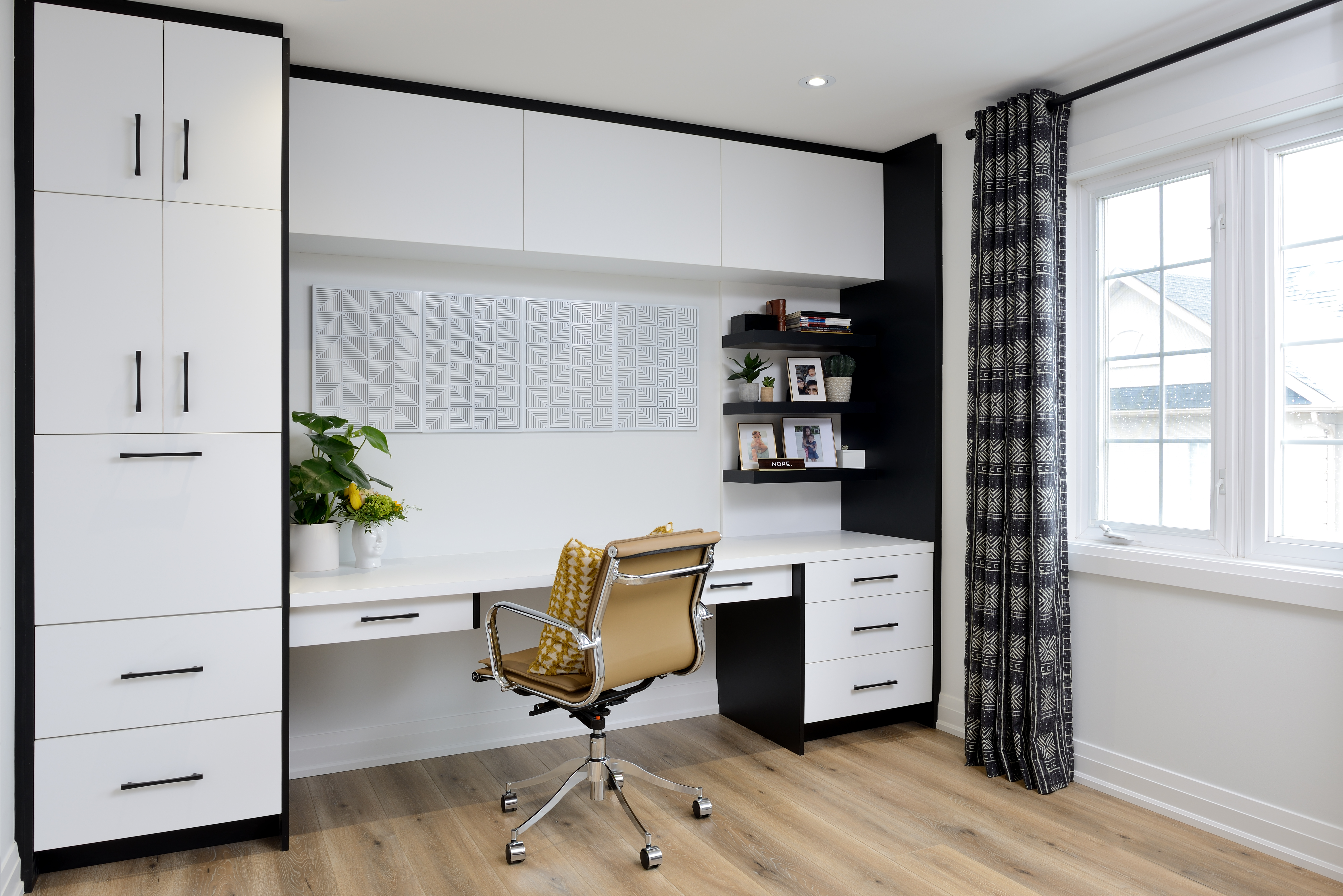 The master bedroom has no lack of color either! Are you surprised? The trending high-gloss, black-trim wall creates the perfect backdrop for the neutral upholstered headboard. To contrast with the black, a white textured duvet hangs over the bed topped with white and yellow pillows. The bright yellow barn door invites you into the en suite. Hannah Banana is the name of that yellow paint color. Now, if that doesn’t make you happy, I don’t know what will.